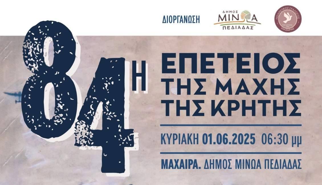Εκδήλωση Τιμής για τους Ήρωες της Μάχης της Κρήτης – Κυριακή 1 Ιουνίου 2025 📢 ΑΝΑΚΟΙΝΩΣΗ Ο Πολιτιστικός Σύλλογος Μαχαίρας, σε συνεργασία με τον Δήμο Μινώα Πεδιάδας, διοργανώνει εκδήλωση...