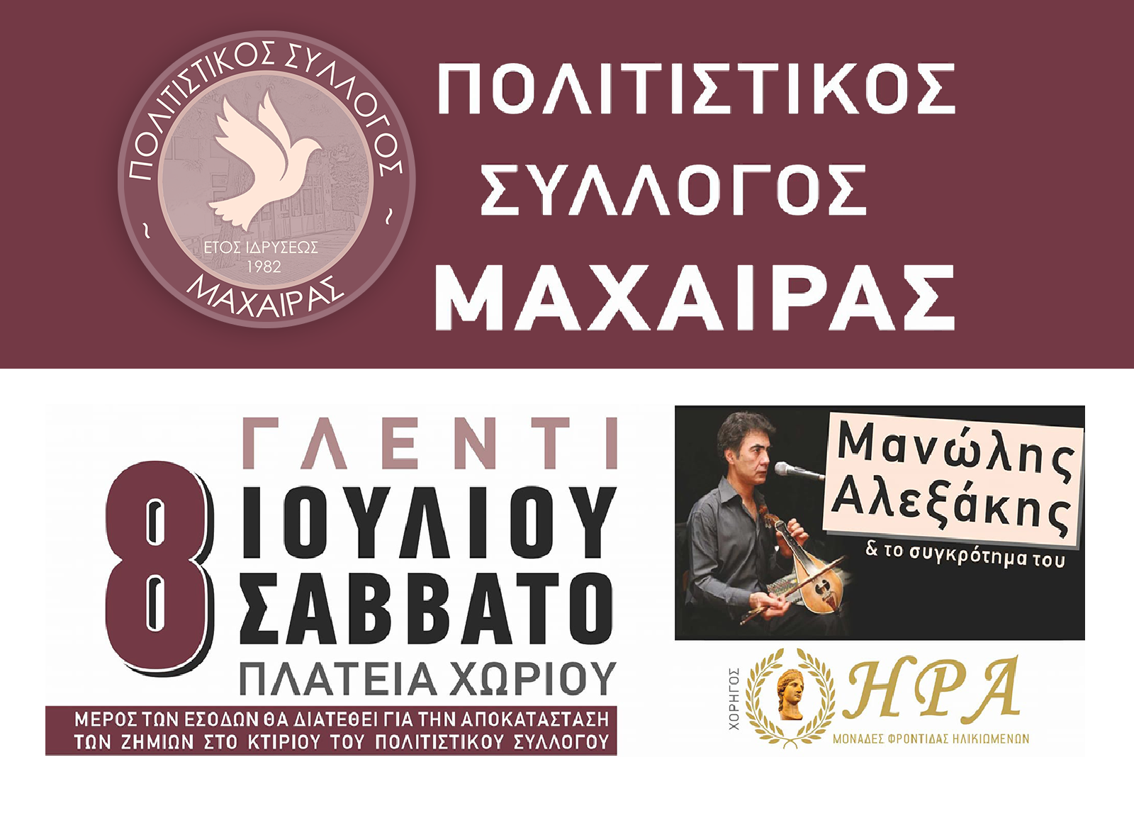 Το Διοικητικό Συμβούλιο του Πολιτιστικού μας Συλλόγου ευχαριστεί θερμά την οικογένεια του κυρίου Αντωνίου Καλογερακη, ιδιοκτήτη της Μονάδα Φροντίδας Ηλικιωμένων – ΗΡΑ και μέγα χορηγό της εκδήλωσης.